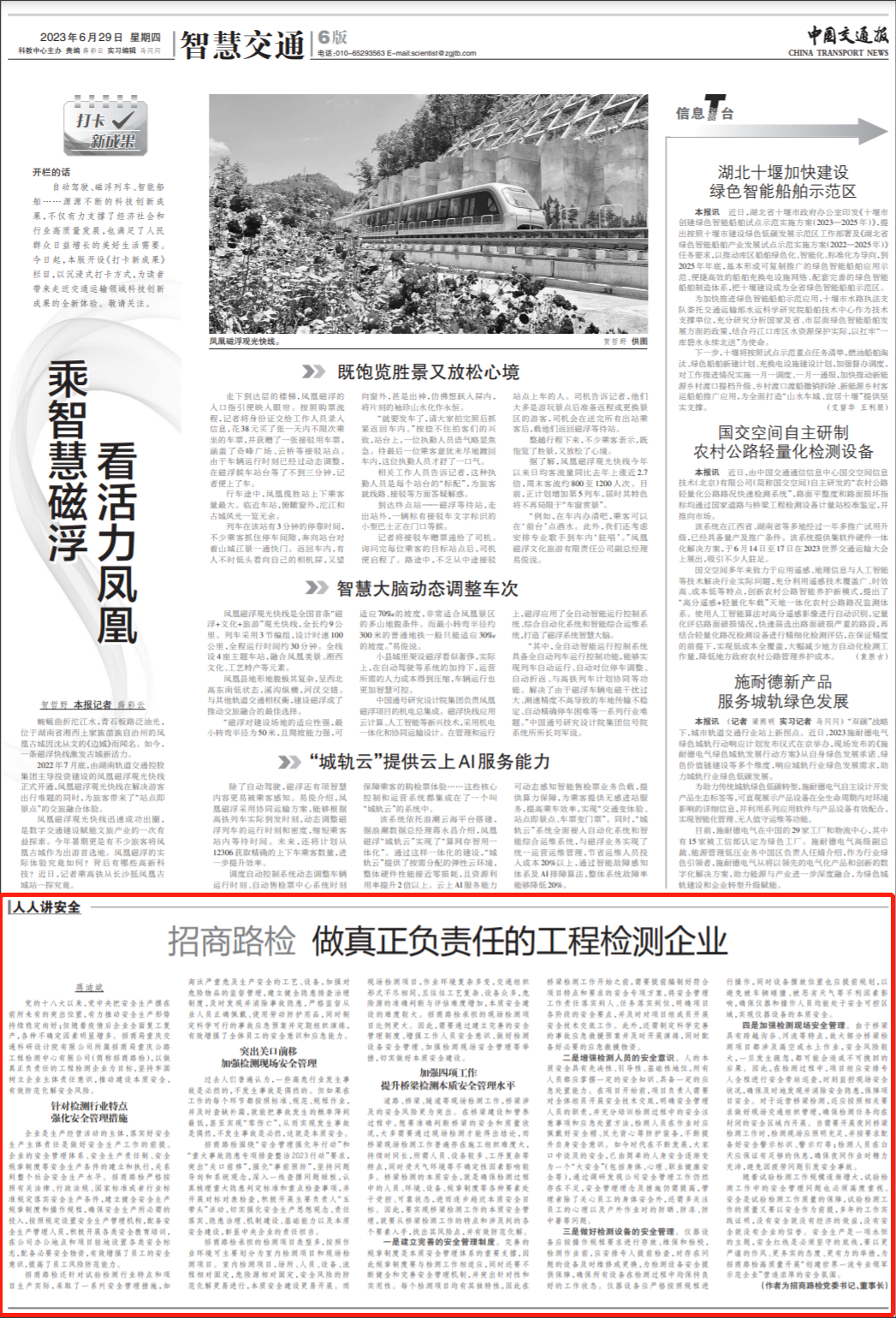 【编者按】 今年六月是第22个全国“安全生产月”,《中国交通报》6月29日在第六版全文刊发了招商交科下属招商路检党委书记、董事长蒋迪斌署名文章《招商路检 做真正负责任的工程检测企业》。文章