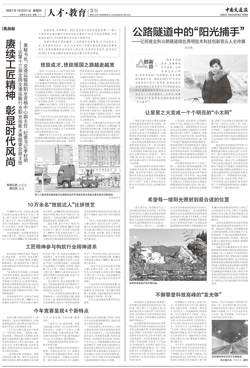 【编者按】史玲娜,现任招商交科交通与节能工程院副院长,自2013年进入公司以来,就长期致力于太阳光光纤照明技术方面的研究工作,她以卓越的成绩诠释了一线科技工作者的责任与担当,获评为2021年“中央企业优秀共产党员”。2021年10月21日,《中国交通报》以《公路隧道中的“阳光捕手”——记招商交科公路隧道绿色照明技术的科技创新领头人史玲娜》为题,刊发专题报道,讲述了史玲娜长期扎根于公路交通科技创新一线的奋斗故事。现将报道原文转载如下: