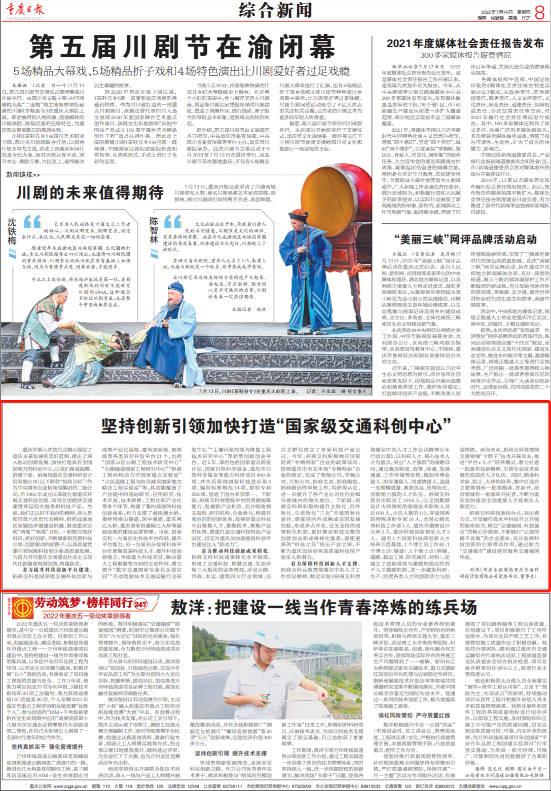 重庆市第六次党代会精心描绘了重庆未来发展的美好蓝图,提出了深入推动创新发展,加快打造具有全国影响力的科创中心,让我们备受鼓舞、倍增干劲。招商局重庆交通科研设计院有限公司(以下简称“招商交科”)作为中央国有企业招商局集团的二级公司,自1965年成立以来就扎根重庆开展交通科技创新,面向全国提供交通建管养运综合服务和科技产品。当前,我们正以时不我待的精神,深入贯彻市第六次党代会精神,抢抓成渝地区双城经济圈建设机遇,推进重庆实现“两地”“两高”目标,一如既往搞好科研,抓好创新,不断探索和完善科技引领、创新驱动的新路子,以高质量党建引领保障科技型企业高质量发展,为奋力书写重庆全面建设社会主义现代化新篇章再创佳绩、再建新功。
