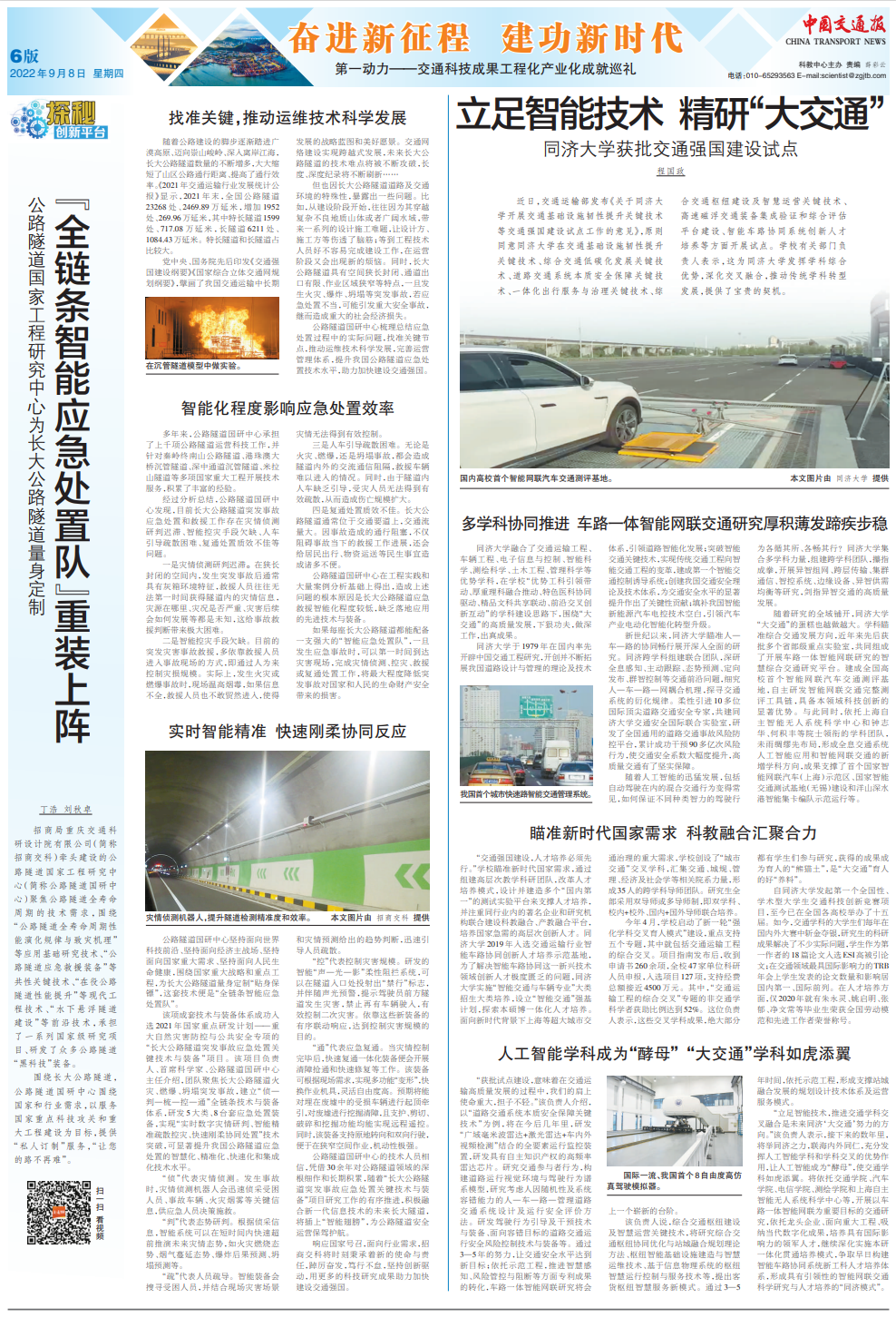 【编者按】2022年9月8日,《中国交通报》在第6版以《公路隧道国家工程研究中心为长大公路隧道量身定制 “全链条职能应急处置队”重装上阵》为题,刊发了招商交科有关报道。报道聚焦长大公路隧道(指洞身距离长,洞内断面大,运行车道多的公路交通隧道)的科技需求,介绍招商交科融合新一代智能信息技术,强化长大公路隧道突发事故应急处置体系建设,提升我国基础设施运维安全整体科技水平,服务交通强国战略的创新成果。现将全文转载如下: