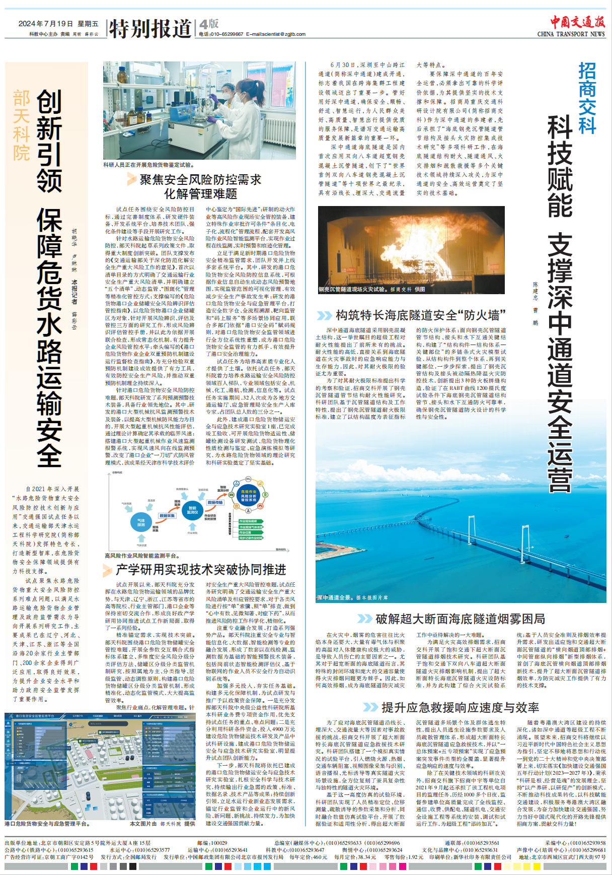 7月19日,《中国交通报》在第四版“特别报道”刊发了《招商交科:科技赋能 支撑深中通道安全运营》文章,介绍了招商交科作为深中通道的参建单位之一,在海底隧道结构耐火、隧道通风、火灾排烟和疏散救援等技术攻关方面作出的贡献。现将全文转载如下: