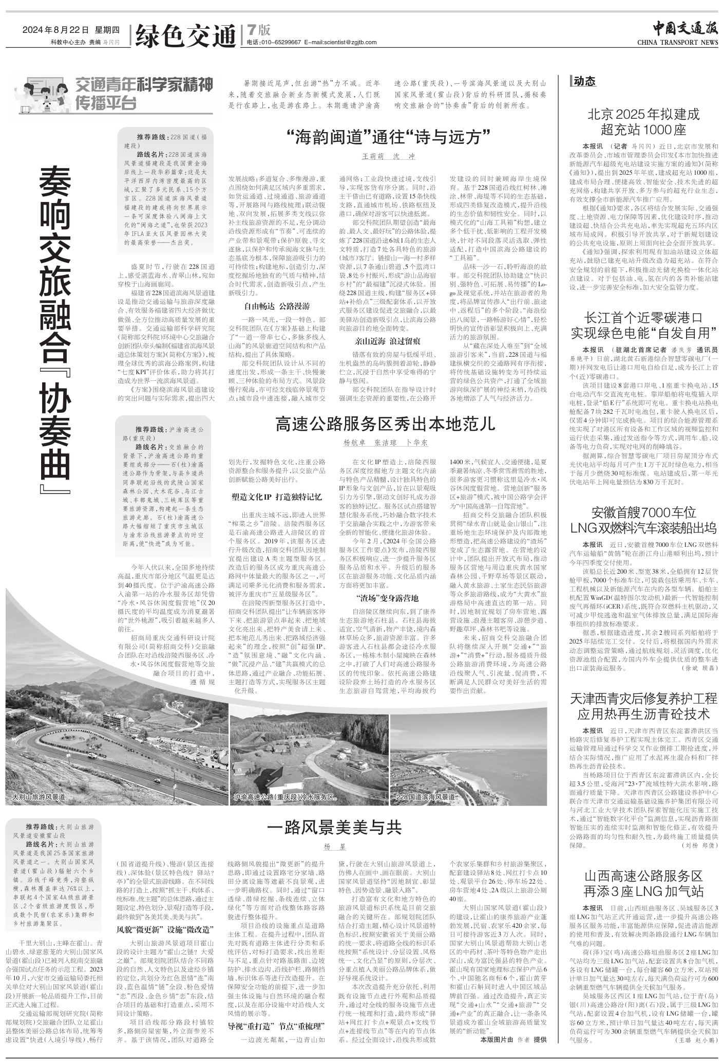 8月22日,《中国交通报》在第七版“绿色交通”专栏中刊发了《高速公路服务区秀出本地范儿》文章。文章介绍了招商交科交旅融合创新发展理念与实践,遵循规划先行,发掘特色文化,注重公路资源整合和服务提升,以交旅产品创新赋能公路美好出行。现将全文转载如下: