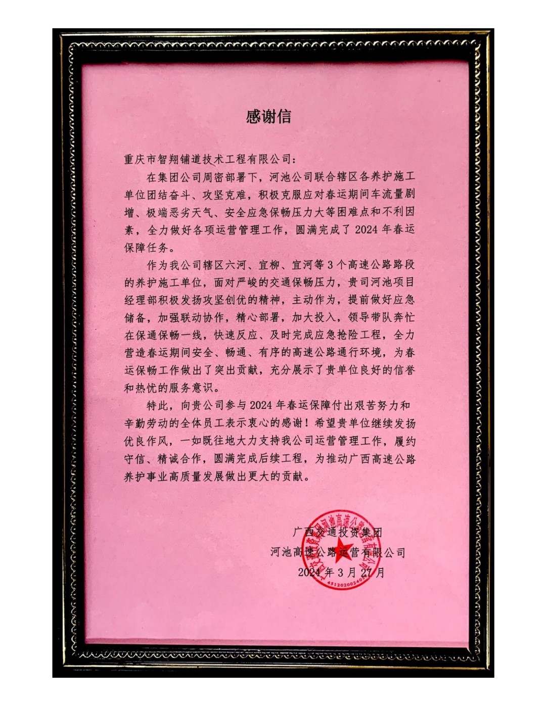 近日,业主单位广西交通投资集团河池高速公路运营有限公司发来感谢信,对我司承接的广西交通投资集团六河路、宜河路、宜柳路2024年养护工程设计施工总承包项目经理部圆满完成2024年春运保障工作任务表示衷心